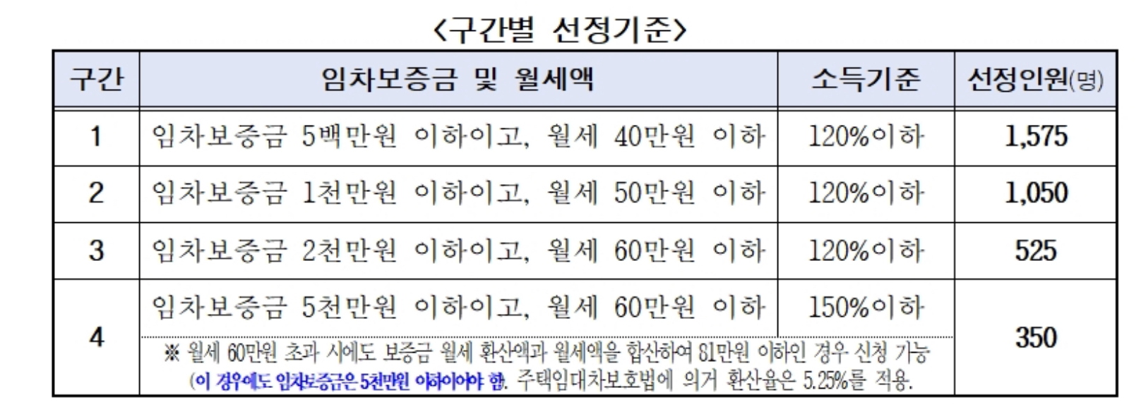 -선정방법 : 임차보증금과 월세 및 소득기준을 4개 구간으로 나누어서 선정하며 인원 초과될 경우 구간별로 전산 추첨합니다.