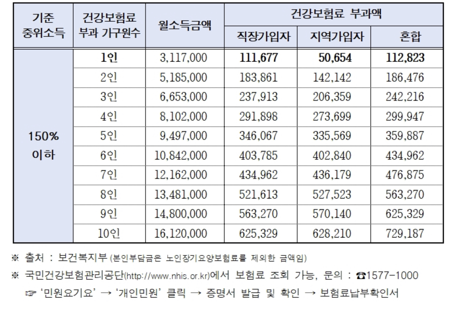 <중위소득별 건강보험료 소득판정 기준표- 23년 기준>